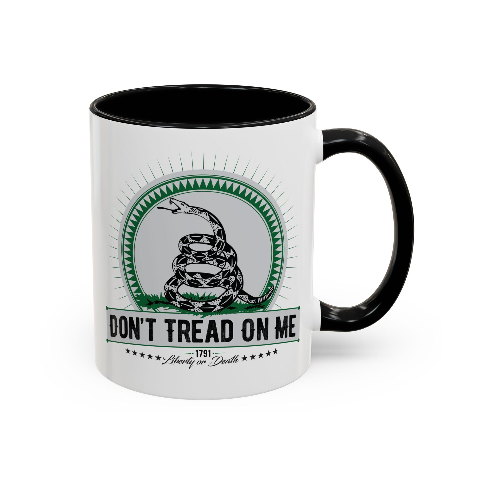 Vintage Gadsden Flag DON'T TREAD ON ME. This 11oz mug features an accented C-Handle that is comfortable to use, as well as an accented interior to add more contrast and color.